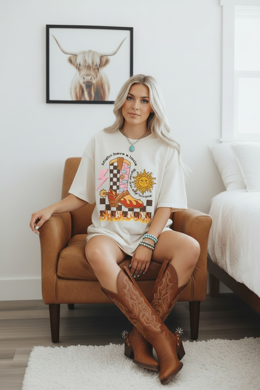 Might have a little SPUR on my boots Tee, Casual Everyday Wear, Fun Summer Top, Turquoise, Turquoise Jewelry, Western