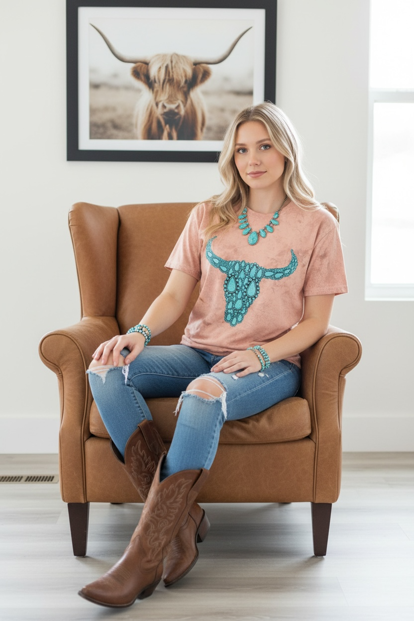 This Turquoise Longhorn Tie Dye tee is ideal for casual outings, music festivals, or simply lounging in style. Show off your love for turquoise and western fashion with this trendy addition to your wardrobe. Order now to elevate your outfit with the perfect blend of comfort and style!
