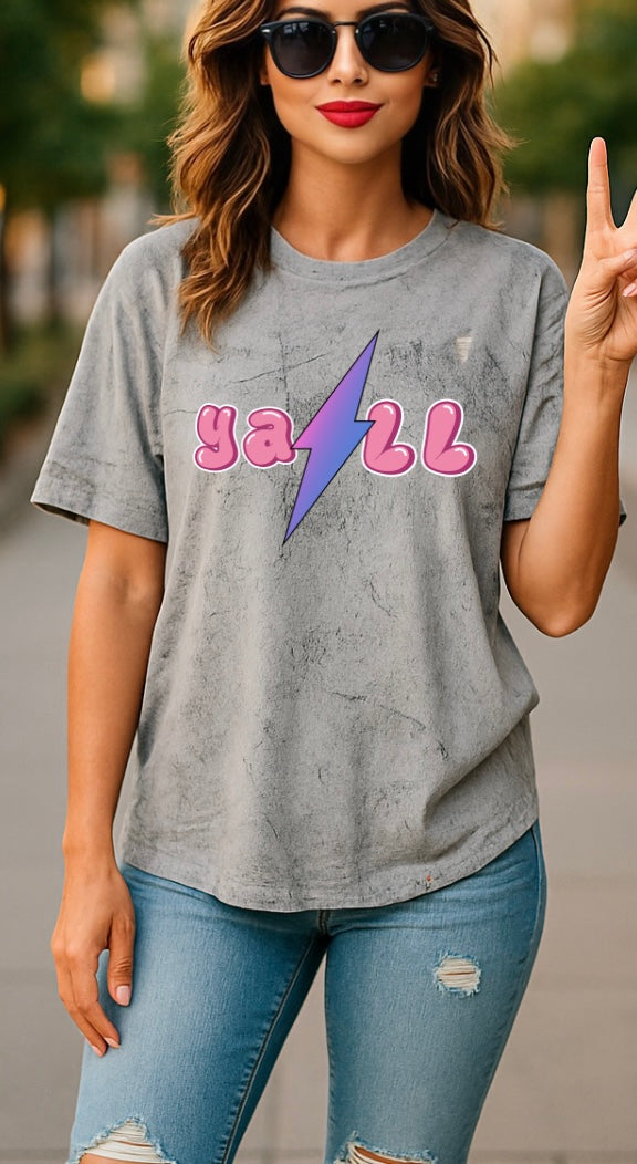 Amp up your everyday style with our "Ya'll" bubble letter tee, featuring a striking lightning bolt design! This shirt perfectly blends playful charm with a bold statement, making it a standout piece for anyone who loves unique graphic tees and a pop of vibrant color. It's more than just a tee; it's a conversation starter and a mood booster, designed for those who embrace fun and express themselves fearlessly.